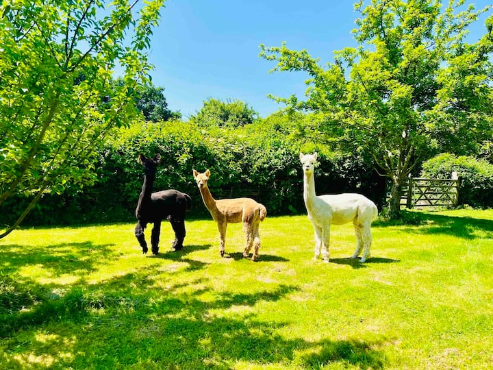 The property ensures guest safety with thorough cleaning protocols, including antibacterial wipes and sprays and cleaning linens at 60 degrees with Dettol antibacterial solution. Outside, guests can relax in the apple orchard and field, and there is gated parking available with free forest tours upon request. New for 2022, The Forest Den has introduced three friendly alpacas—Falko, Delta, and Buttons—that guests can meet upon request.